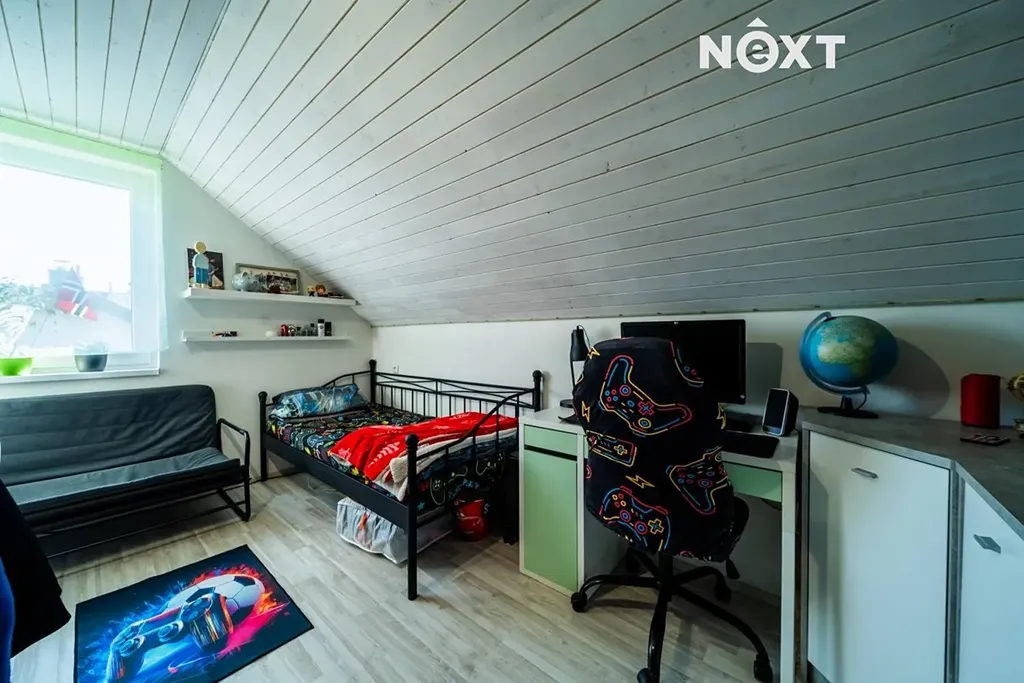 Užitná plocha 87 m² a dispozice 5+kk se na první dobrou může zdát jako zbytečně moc pokojů, ale pokud máte děti, tak ty tři samostatné pokojíky nahoře jistě oceníte. No a pokud je nemáte, můžete buď jednu příčku jednoduše odstranit a pokoj si zvětšit, případně můžete dojít k rozhodnutí, že chcete podpořit statistiky porodnosti a pořídíte si dítě třetí. Kromě zmíněných pokojů nahoře najdete prostornou koupelnu s vanou.