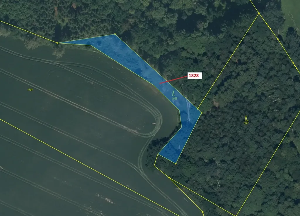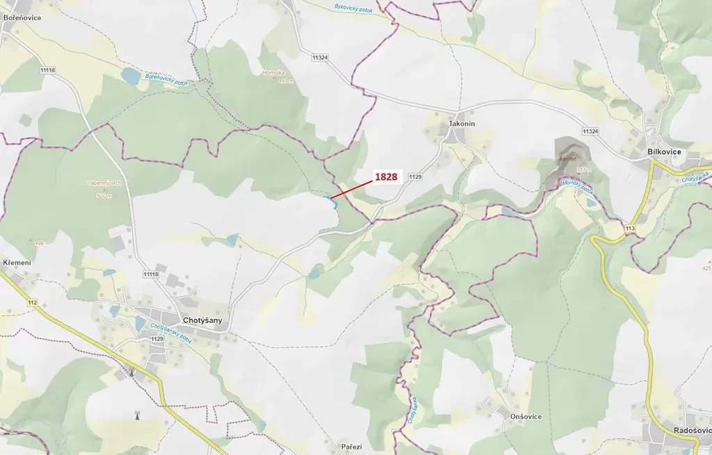 Lesní pozemek o výměře 1841 m2, parcelní číslo 1828, podíl 1/1, katastrální území Chotýšany, obec Chotýšany, obec s rozšířenou působností Benešov, okres Benešov, Středočeský kraj. Po těžbě.