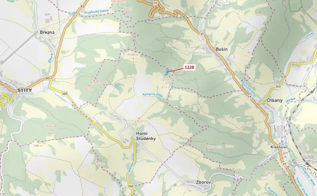 Lesní pozemek o výměře 10 403 m2, parcelní číslo 1228, podíl 1/1, katastrální území Horní Studénky, obec Horní Studénky, obec s rozšířenou působností Zábřeh, okres Šumperk, Olomoucký kraj.
