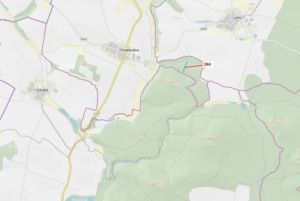 Lesní pozemek o výměře 4302 m2, parcelní číslo 384, podíl 1/1, katastrální území Chotěbudice, obec Chotěbudice, obec s rozšířenou působností Moravské Budějovice, okres Třebíč, Kraj Vysočina.