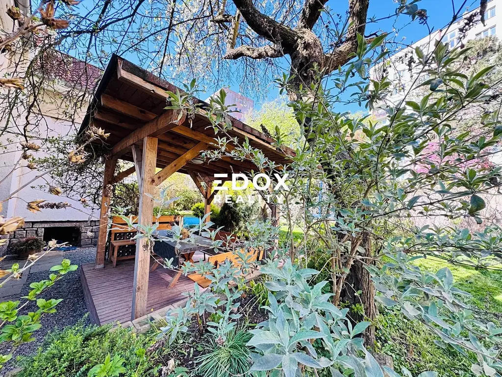 Zahrada je osázena ovocnými stromy a okrasnými dřevinami. Dále se na zahradě nachází velmi příjemný altán s posezením, funkční bazén a zahradní domek.