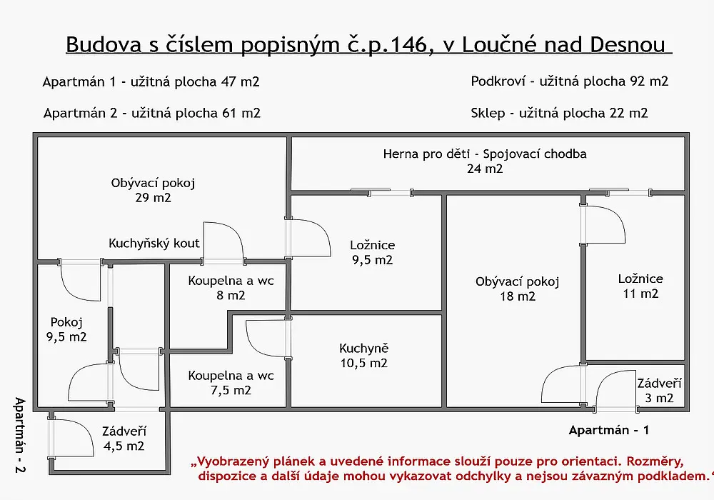V objektu se nacházejí dvě samostatné apartmánové části o přibližné užitné ploše: