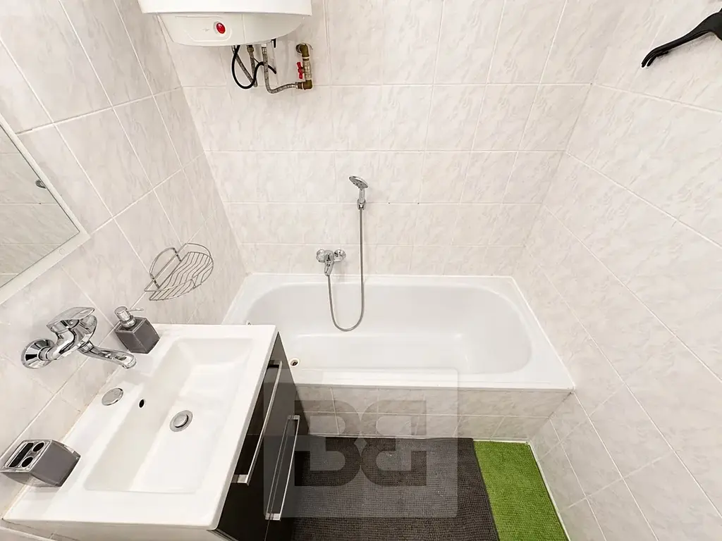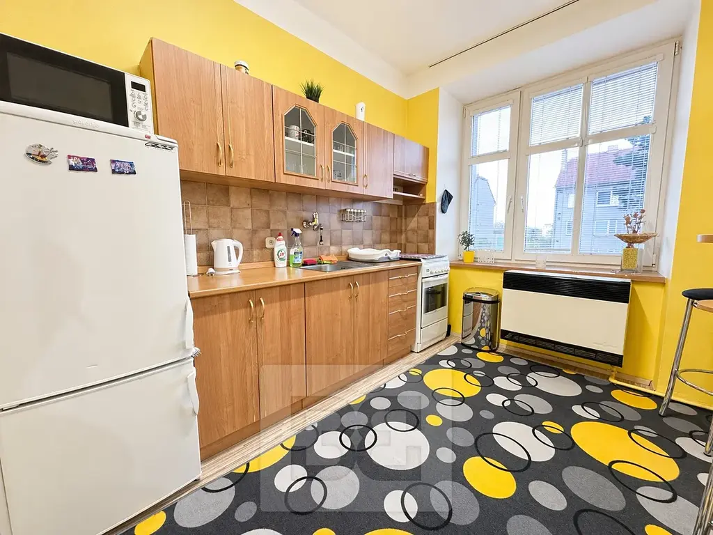 Dispozice bytu nabízí samostatnou kuchyni a prostorný obytný pokoj. Kuchyň je vybavena kuchyňskou linkou, sporákem, lednicí a základními spotřebiči. Obývací část poskytuje dostatek prostoru pro pohodlné bydlení i pracovní zázemí. Koupelna je vybavena vanou a umyvadlem, toaleta je samostatně.