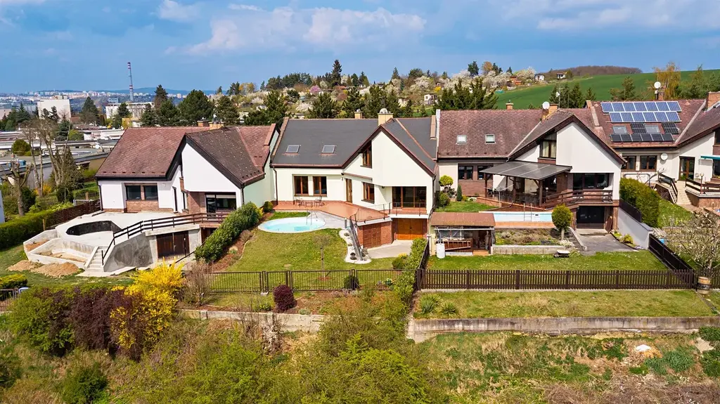 - krásná udržovaná zahrada domu s bazénem terasu směřovanou na jižní stranu