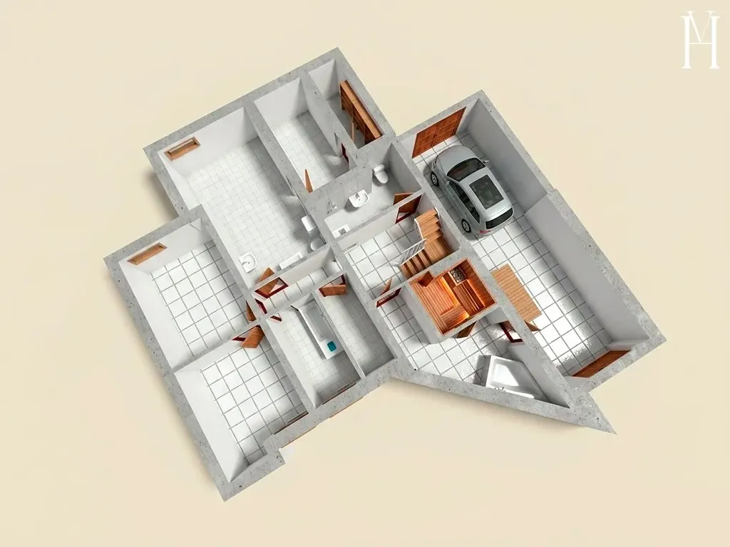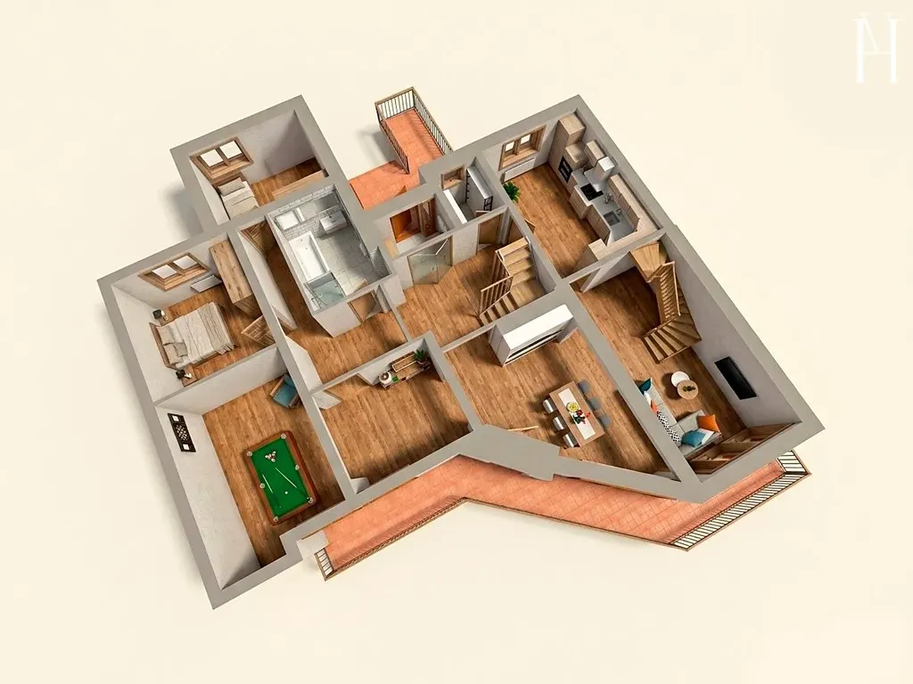 Celkem 8 pokojů, 2 koupelny, 3 toalety, tech.mítnost, kotelna, sklad nářadí, sklep 6 místností, sauna,