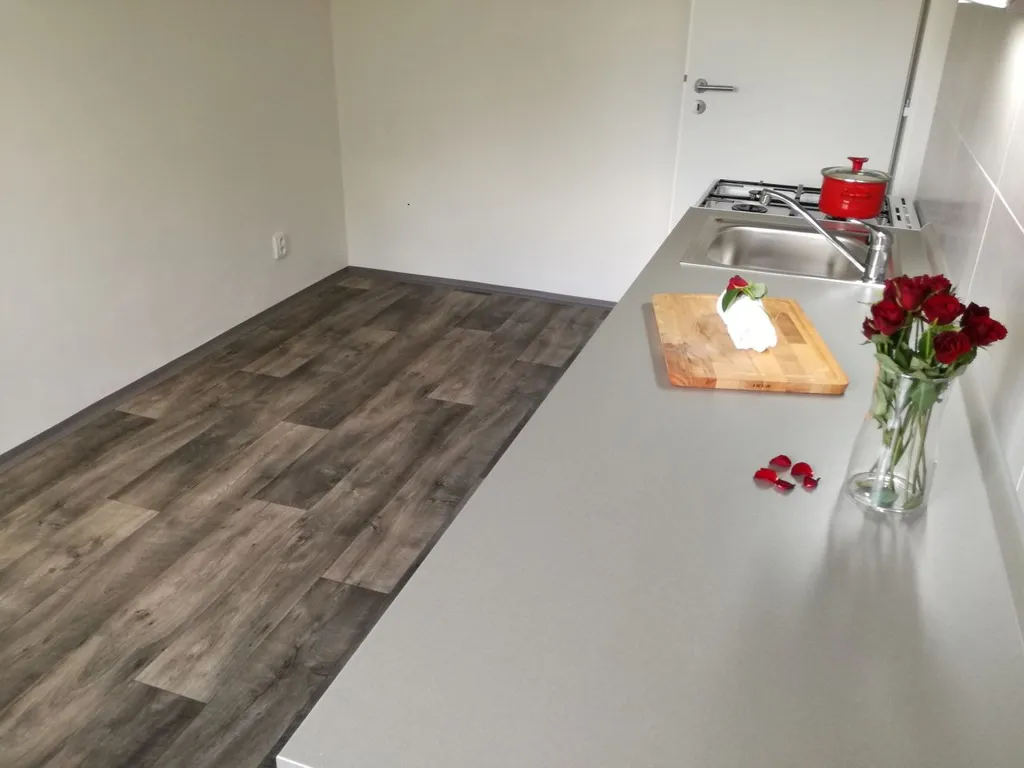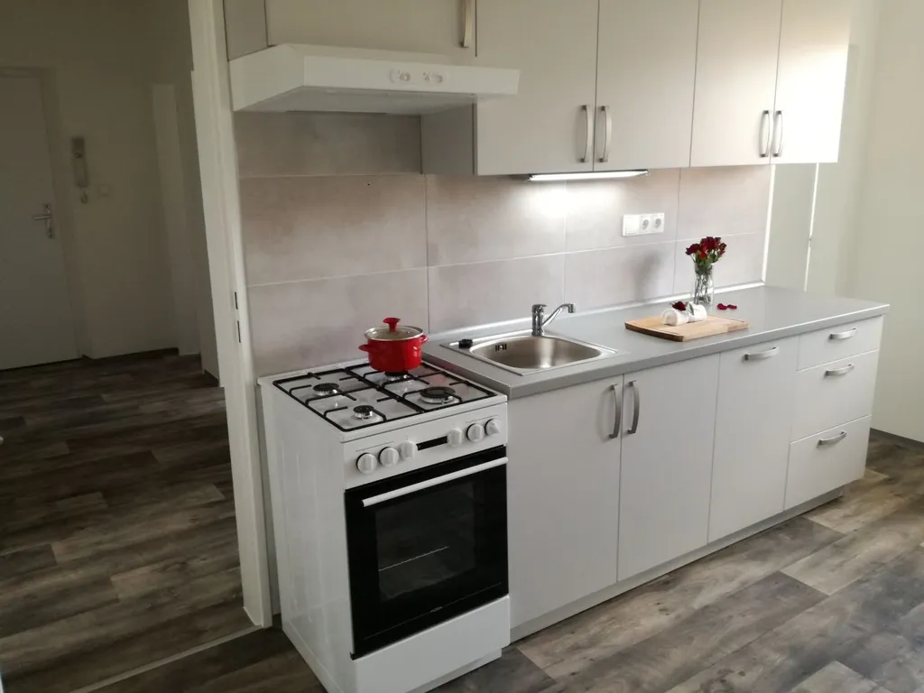 Byt disponuje kuchyňskou linkou s kombinovaným sporákem a digestoří a možností připojení myčky. Součástí kuchyně je i komora.