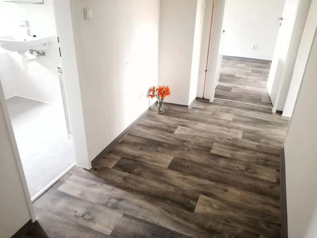 Byt má vyzděné jádro, podlahy, rozvody, omítky, interiérové dveře.