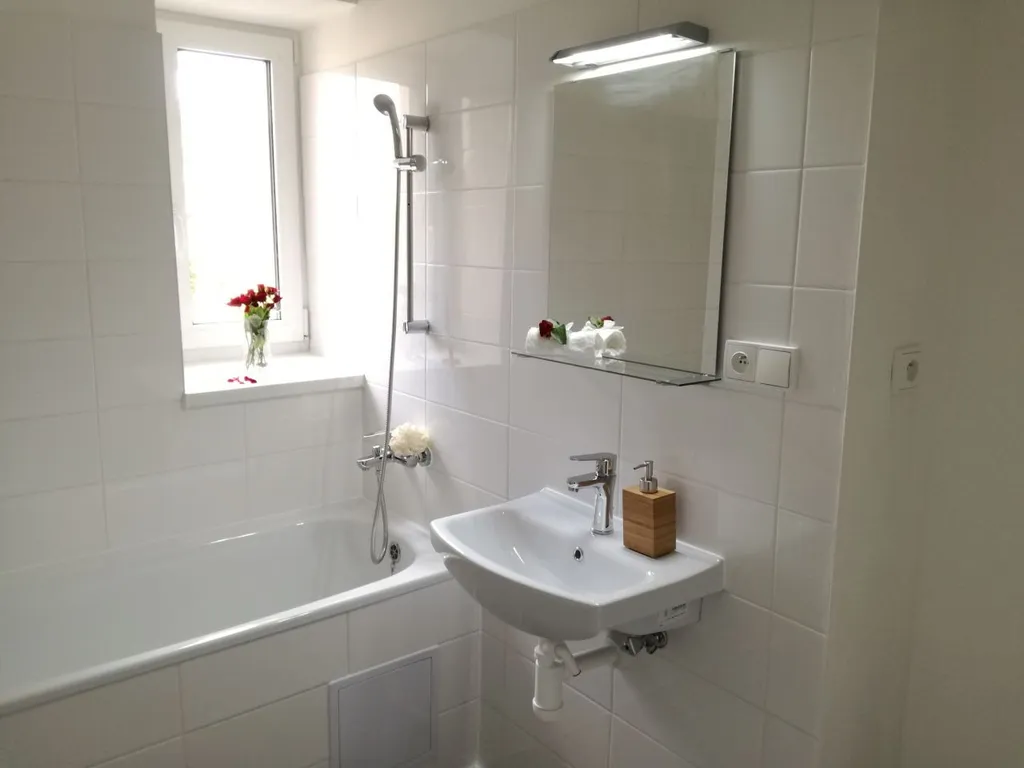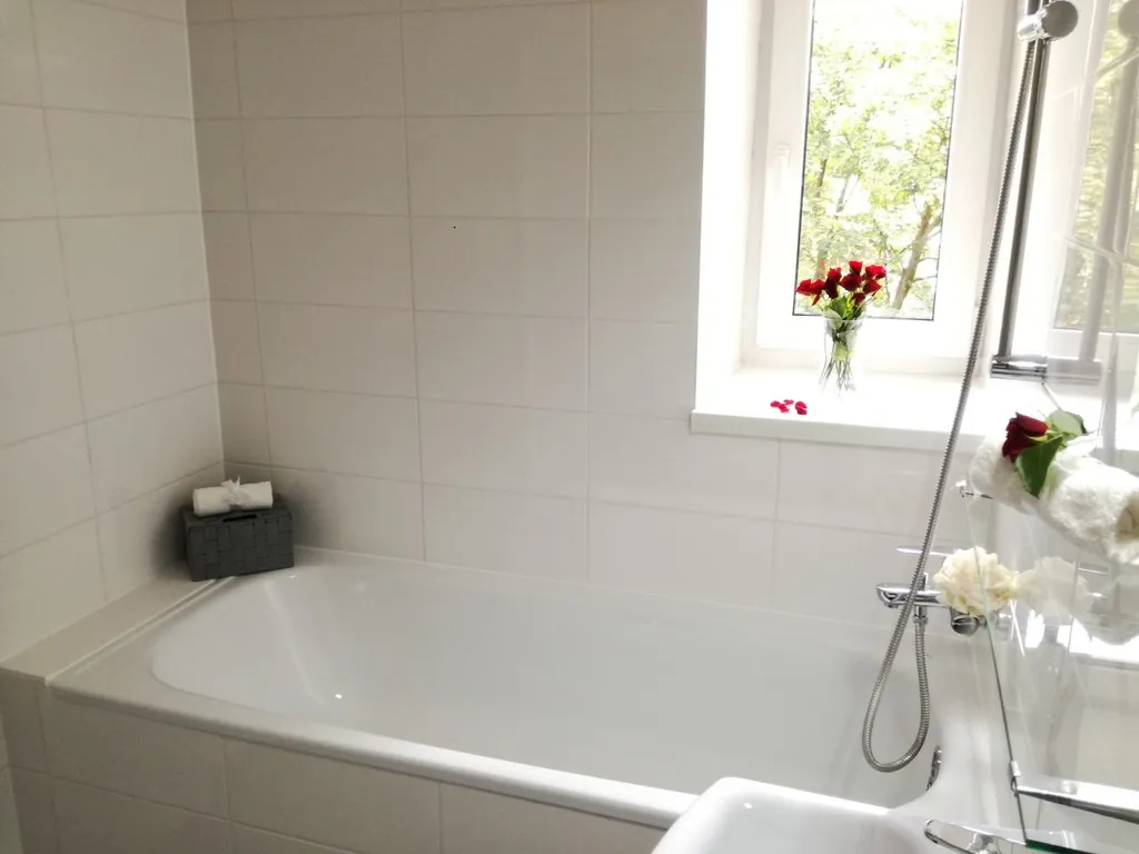 Prostorná koupelna s vanou a umyvadlem a s možností připojení pračky, toaleta je odděleně.