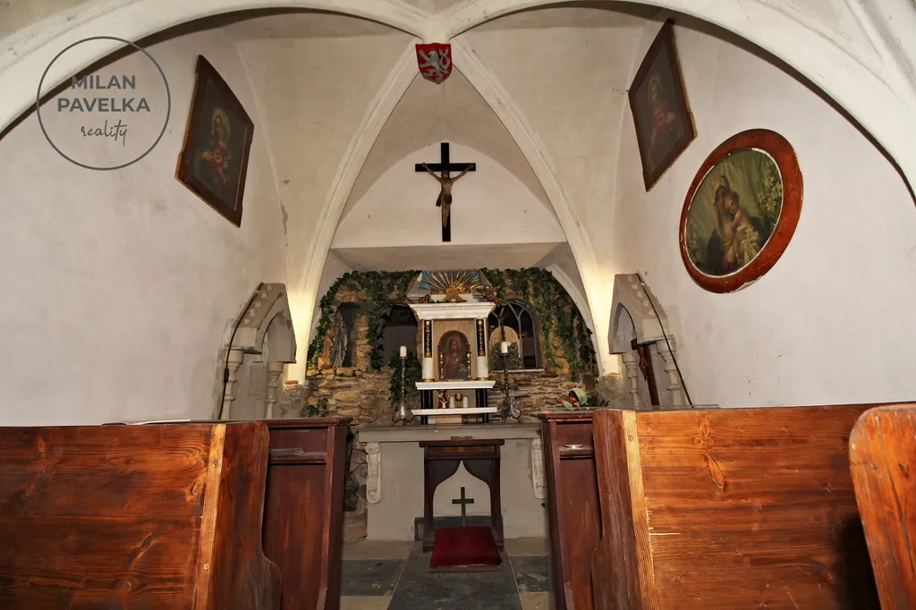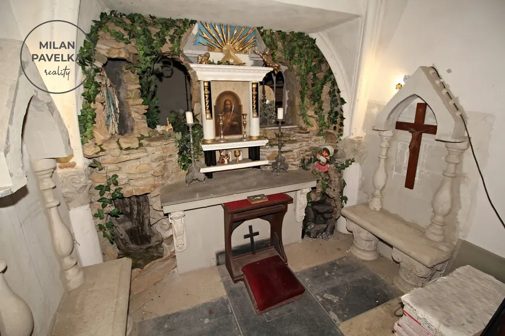 Nového majitele také může zaujmout vlastní originální kaple s oltářem a replikou gotické klenby stropu. Objekt je částečně podsklepen a má další půdní prostory.
