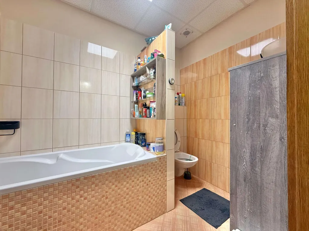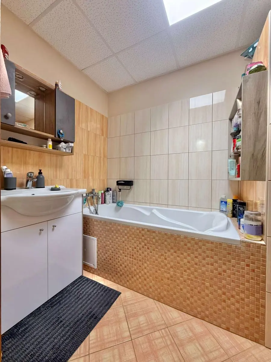 Stylová koupelna: Koupelna prošla kompletní proměnou. Dominantou je vana se skleněnou zástěnou a vkusný obklad v přírodních tónech doplněný o mozaiku. WC je řešeno v rámci oddělené niky pro větší soukromí.