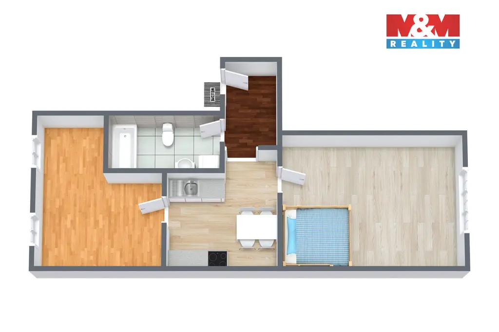 Dispozice bytu je praktická a přehledná. Dominantou je prostorný obývací pokoj, dále samostatná ložnice, kuchyň s jídelním koutem, koupelna a předsíň. Velkým bonusem je zděný sklep o velikosti 22 m², který poskytuje dostatek úložného prostoru například pro kola, sportovní vybavení či další věci.