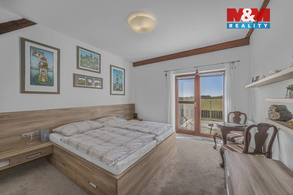 Celoplošné podsklepení spolu s pěti garážovými stáními vytváří perfektní zázemí pro podnikání, dílnu nebo bezpečné parkování vozového parku.