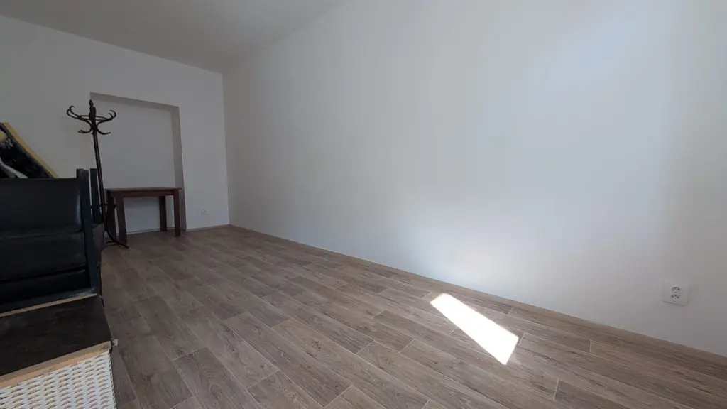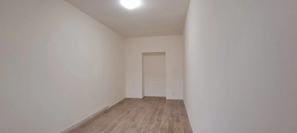 Byt disponuje vstupní předsíní, ze které je vstup do koupelny se sprchovým koutem a toaletou. Dále se dostaneme do obývacího pokoje s kuchyňským koutem, kde je k dispozici kuchyňská linka, sporák se sklokeramickou varnou deskou, trouba a digestoř. Na obývací pokoj navazuje samostatná podlouhlá místnost, vhodná jako ložnice či pracovna.