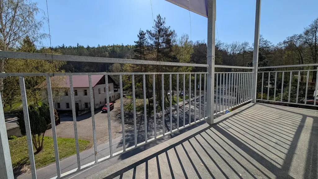 Velkou výhodou bytu je vstup na prostorný balkon z obývacího pokoje, který poskytuje místo pro relax a krásný výhled na koupaliště.