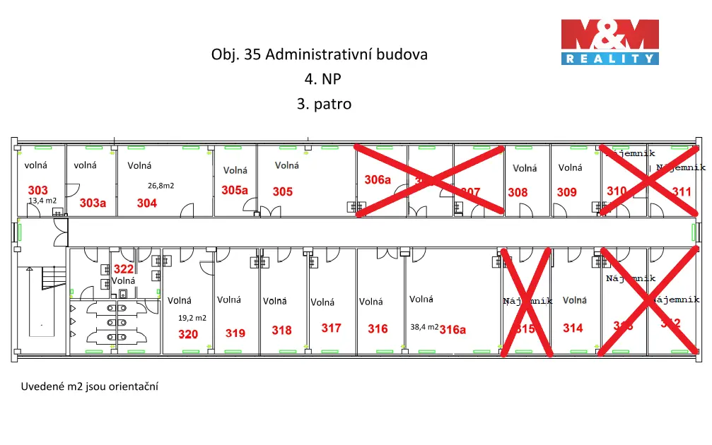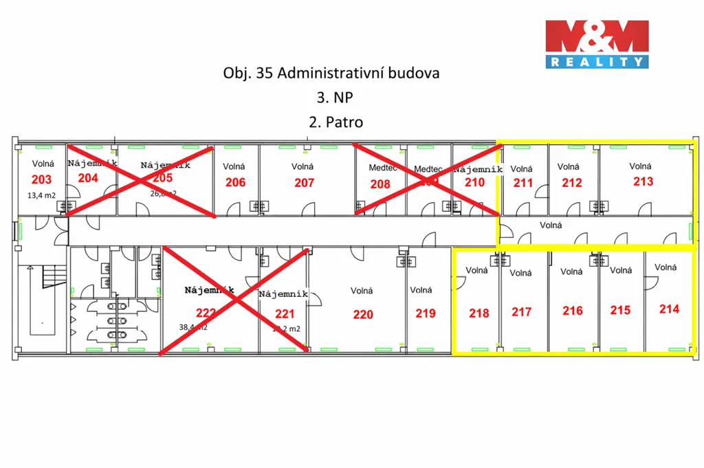 Nabízíme pronájem volných kanceláří v administrativní budově na ul. Brněnská v Hradci Králové. Kancelář na plánku označená jako č. 219 se nachází ve 3. nadzemním podlaží. V místnosti je umyvadlo. Toalety a kuchyňka jsou společné. Součástí nájmu je i jedno parkovací místo v areálu u budovy. Volné kanceláře jsou jak ve 3. tak i ve 4. nadzemním podlaží. Nájemné činí 2500 Kč/m²/rok + poplatky 1000 Kč/m²/rok. Více informací u makléře.