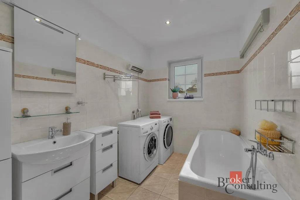 V přízemí domu naleznete prostorný a světlý obývací pokoj s výstupem na venkovní terasu, která Vám poskytne krásný výhled do zahrady. Součástí přízemí je moderní kuchyňský kout a jídelna. Kuchyňská linka je vybavena dvěma troubami a plynovým sporákem na PB, s keramickou deskou a myčkou. Dále zde najdete ložnici s vestavěnou skříní a koupelnu s vanou a samostatným WC.