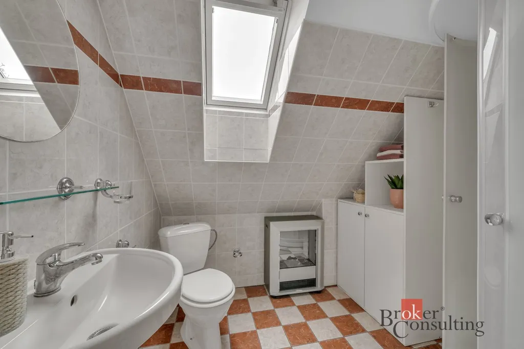 V patře domu se nacházejí dva dětské pokoje, pracovna a koupelna se sprchovým koutem a WC. Z jednoho dětského pokoje je vstup do útulného obytného podkroví.