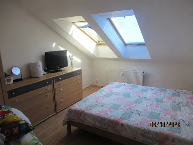 Dispozice bytu dále zahrnuje ložnici a dva samostatné pokoje, ideální jako dětské pokoje, pracovna či pokoj pro hosty. K dispozici je koupelna, samostatná toaleta, vstupní předsíň a samostatná šatna, která výrazně zvyšuje komfort každodenního bydlení. Zkosené stropy v části pokojů dodávají interiéru osobitý charakter a útulnou atmosféru.