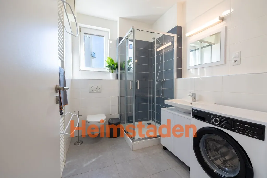 Koupelna je vybavena vlastní pračkou a v přízemí domu je navíc k dispozici společná prádelna s pračkou a sušičkou za poplatek. Dům disponuje výtahem a je zde také možnost pronájmu garážového stání, což zvyšuje komfort každodenního bydlení.