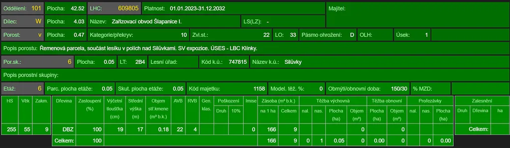 Prodej většinového 3/4 podílu menšího lesního pozemku v katastrálním území Silůvky, okr. Brno-venkov. Jedná se o pozemek p.č. 967/96 o výměře 174 m². Pozemek je situován na rovině s přístupem po okraji louky až k pozemku. Na ploše pozemku se dle platných LHO nachází lesní porost dubu zimního ve věku 58 let. Pozemek sousedí s lesním majetkem LČR. Foto je aktuální. Informace na tel. nebo e-mailu.