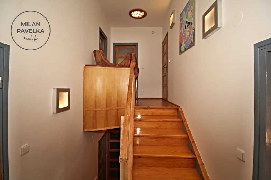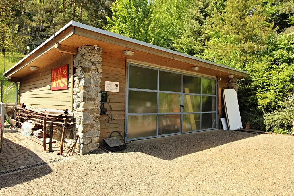 K zaparkování automobilů, zahradní techniky, vybavení pro údržbu domu či okolí vám budou složit tři zděné garáže o celkové podlahové ploše 200 m². Jedna z garáží nyní slouží jako galerie majitele a je zde také klimatizační jednotka s vytápěním tepelným čerpadlem.