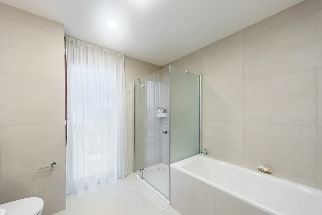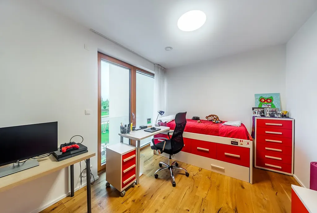 Vysoký standard vybavení: dřevěné podlahy, dřevěná okna s trojskly.