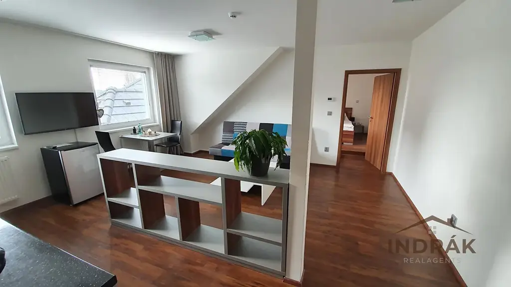 Nabízíme k pronájmu exklusivní kompletně zařízený apartmán o dispozici 2+kk, výměře 45 m2, umístěný ve 3. patře rekonstruovaného cihlového domu. Objekt se nachází v blízkosti centra města na ulici Vrchlického, v bezprostřední blízkosti fotbalového stadionu, v prostorách hotelu Graphic. Součástí zařízení obývacího pokoje je vybavená kuchyň s elektrickou troubou, varnou deskou a myčkou, lednice, mikrovlnná trouba, rychlovarná konvice, kávovar, obývací stěna, plochý televizor, rozkládací pohovka a stolek, v ložnici pak dvě postele. Koupelna je vybavena sprchovým koutem, WC, pračkou a topnou žebřinou. K vytápění apartmánu slouží vlastní plynový kotel. Nájemné činí 15.000,- Kč měsíčně + zálohy na energie ve výši 3000,- Kč. V ceně je zahrnut internet. Kauce činí 20.000,- Kč, provize RK 15.000,- Kč. K dispozici od 1. 5. 2026. Jedná se o bydlení ve vyhledávané lokalitě města, výhodou je výborná restaurace umístěná v suterénu domu a možnost parkování před hotelem. Vchod k apartmánu je ze zadní části budovy. Doporučujeme prohlídku.