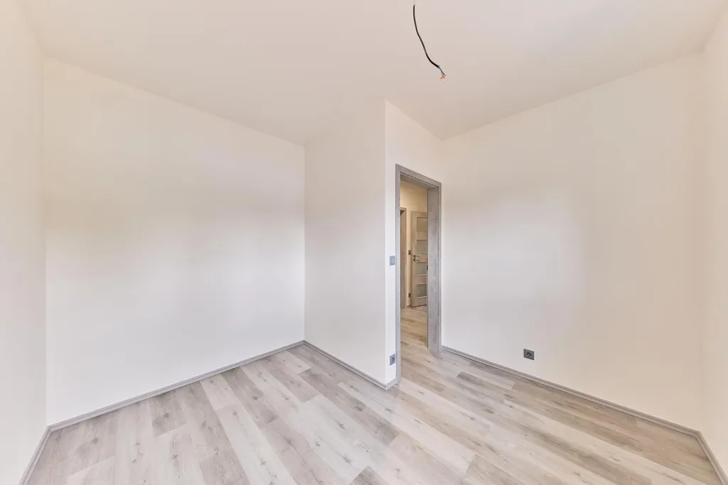 Součástí vybavení je nová kuchyňská linka se spotřebiči. Dispozice bytu zahrnuje vstupní zádveří, prostorný obývací pokoj s kuchyňským koutem a vstupem na terasu a zahradu, samostatné WC s přípravou pro pračku a sušičku, a ve druhém podlaží ložnici, dva dětské pokoje a koupelnu s WC.