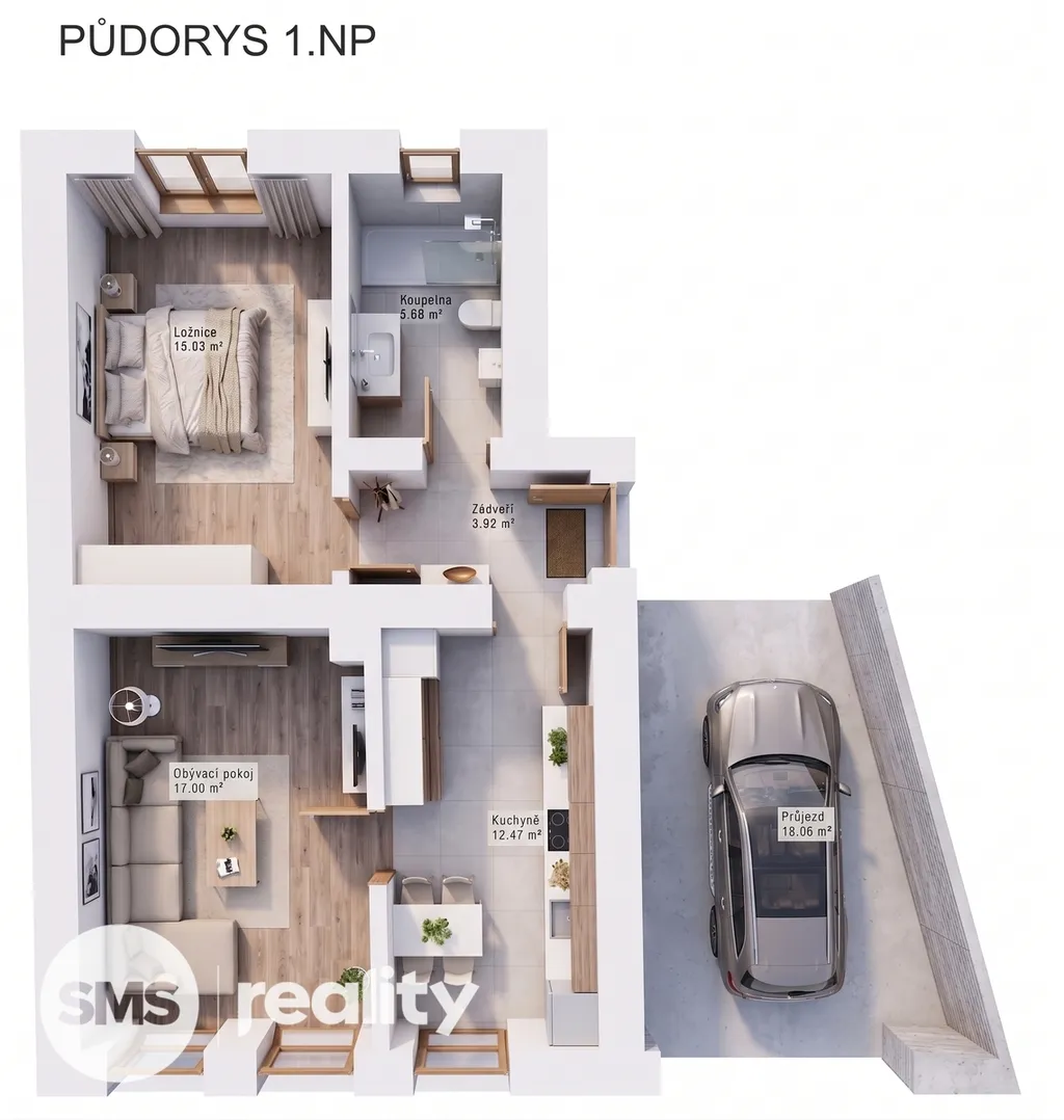 Dispozice domu zahrnuje ložnici, koupelnu, zádveří, obývací pokoj a kuchyni. Velkým benefitem je vlastní garážové stání.
