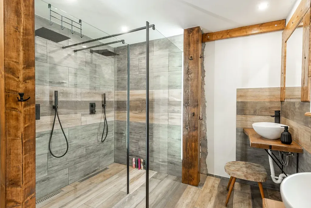 Přízemí - přes vstupní chodbu se dostaneme do kuchyně, ze které je vstup do prostorného obývacího pokoje s krbem či na druhou stranu do koupelny se sprchovým koutem a WC. K dispozici je dále samostatné WC pro komfort i při plném obsazení. Dále se dostáváme do technického zázemí mj. pro údržbu a skladování.