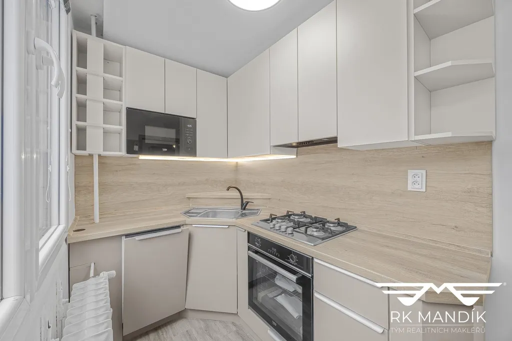 Součástí vybavení je zcela nová, na míru vyráběná kuchyňská linka s maximálním využitím prostoru. Je osazena kvalitními vestavnými spotřebiči s pokročilými funkcemi, mezi které patří plynová varná deska, elektrická trouba, mikrovlnná trouba, kombinovaná lednice s mrazákem, digestoř s odvodem a myčka nádobí.