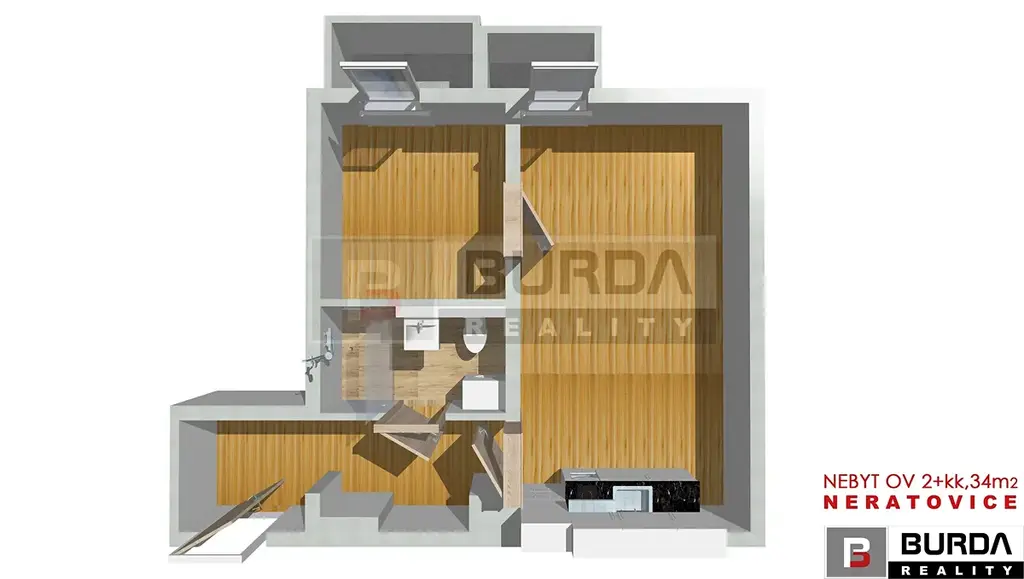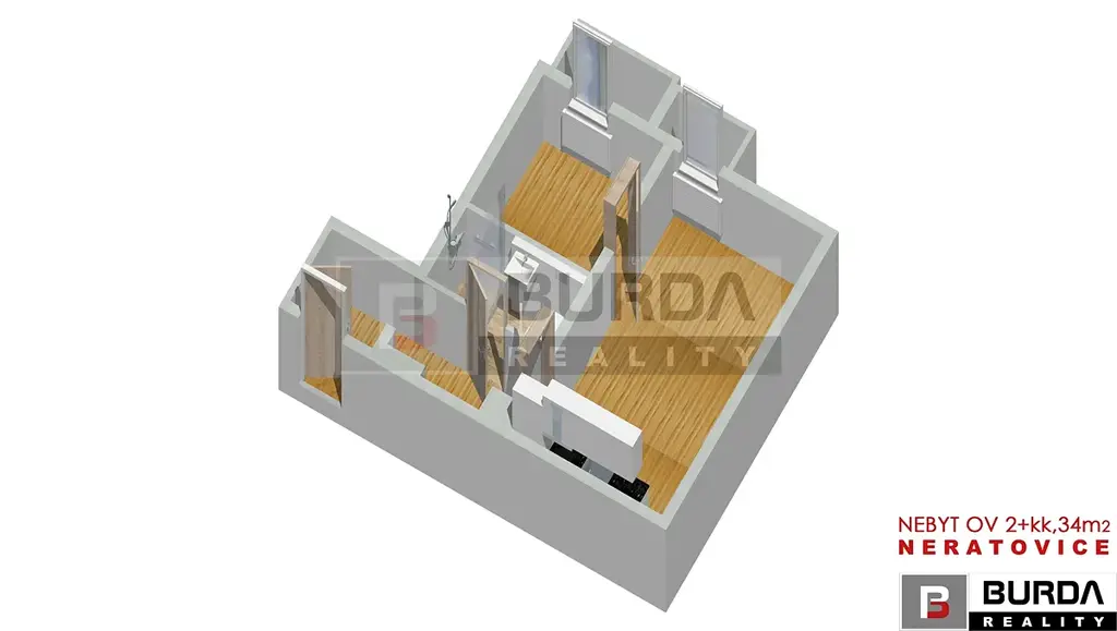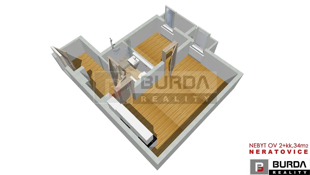 Specialista na Neratovice Vám exkluzivně nabízí k pronájmu ateliér, dispozice 2+kk o ploše 34,87 m2 v suterénu revitalizovaného panelového domu v Neratovicích.