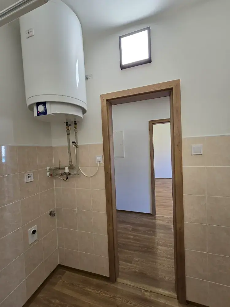 Vytápění je řešeno elektrickými přímotopy s levnějším tarifem HDO. Teplou vodu zajišťuje bojler, umístněný u stropu v koupelně, pod kterým je vytvořeno místo pro umístění pračky.