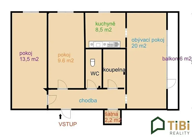 Vstupní chodba nabízí vstupy do všech místností. Dominantu tvoří obývací pokoj o přibližné výměře 20 m2, ze kterého se vchází na balkon, kde je možnost posedět a zrelaxovat při sklence vína či šálku kávy.