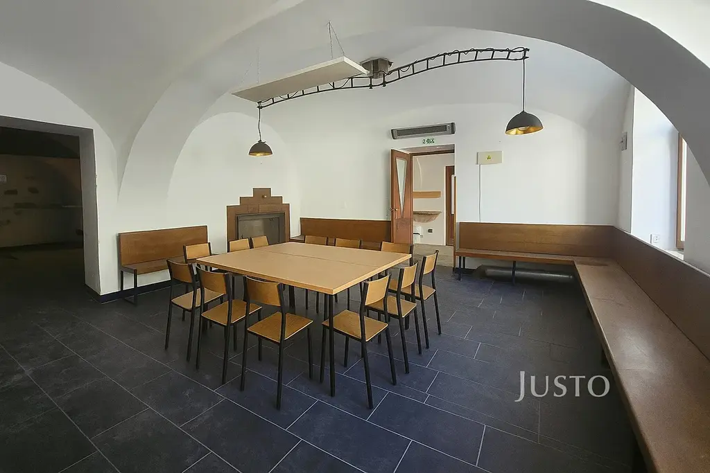 Součástí prostor je zázemí zahrnující kuchyň, šatnu, úklidovou místnost a sociální zařízení. K dispozici je také samostatný salonek s vlastní toaletou, ve kterém jsou instalována krbová kamna.