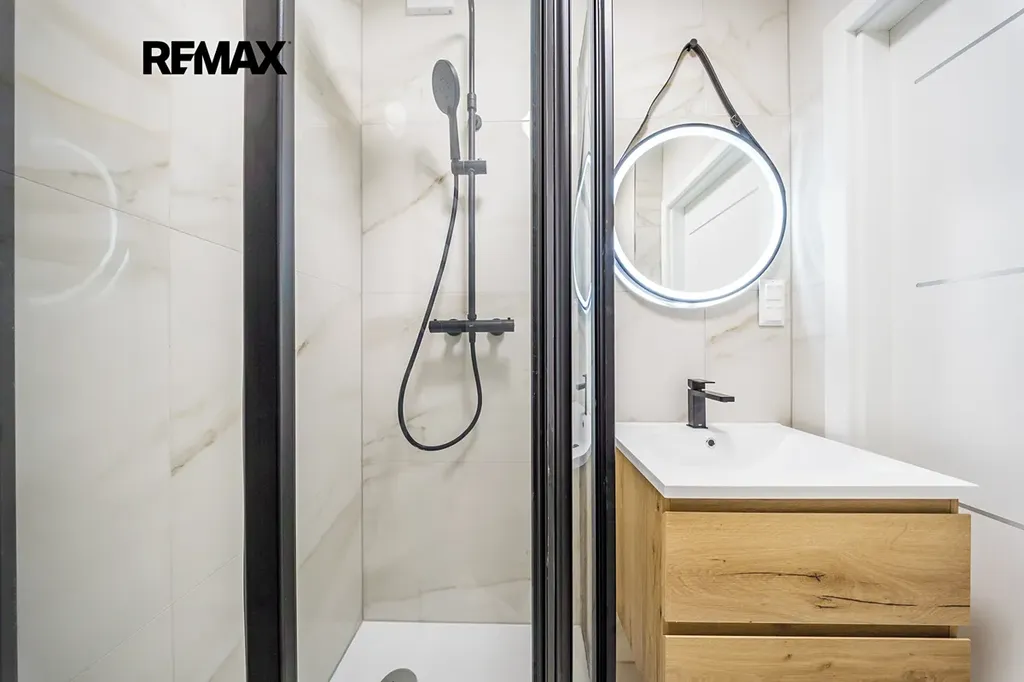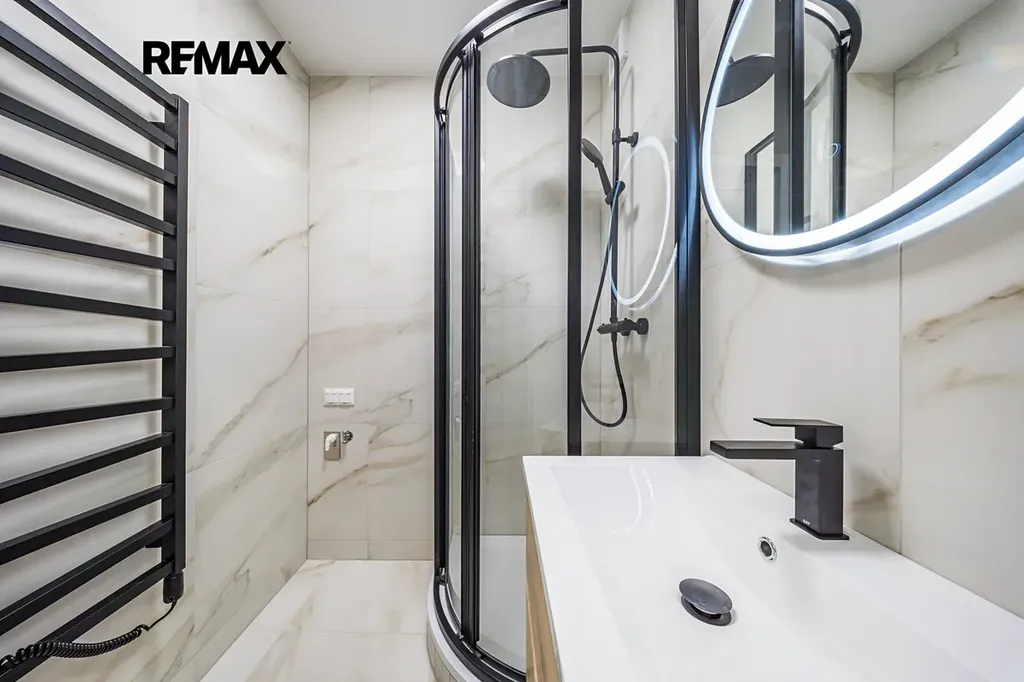 Koupelna (2,2m²) je vybavena topným žebříkem, designovým dotykovým zrcadlem se třemi režimy osvětlení a přípravou na pračku a sušičku. Toaleta je samostatná se systémem Geberit.