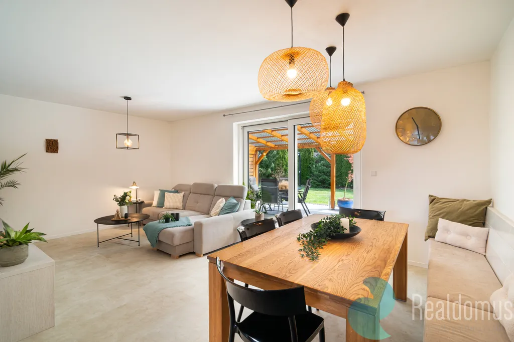 Srdcem domu je světlý obývací pokoj plynule propojený s kuchyní. Celý prostor působí velmi vzdušně a otevřeně a vytváří ideální místo pro rodinný život i setkávání s přáteli. Velké portálové dveře navazují na terasu se vstupem do zahrady, která nabízí příjemné soukromí a klid pro relaxaci. Součástí prodeje je také vířivka umístěná na terase, která ještě více podtrhuje komfort tohoto bydlení.