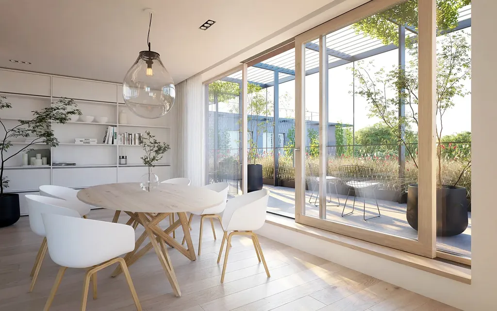 Velkorysý obývací prostor je přirozeně propojen s terasou, která plynule navazuje na střešní terasu – ideální místo pro relaxaci, rodinné zázemí i společenské využití.