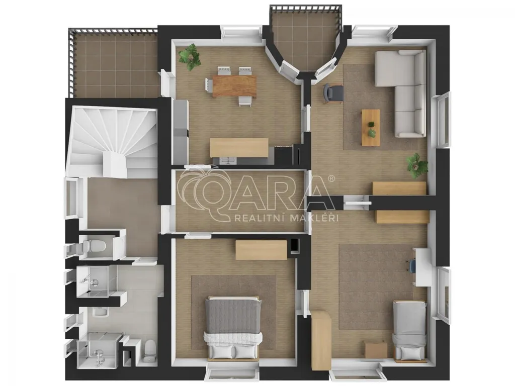 - Druhý byt v přízemí: 91 m² + terasa 28 m²