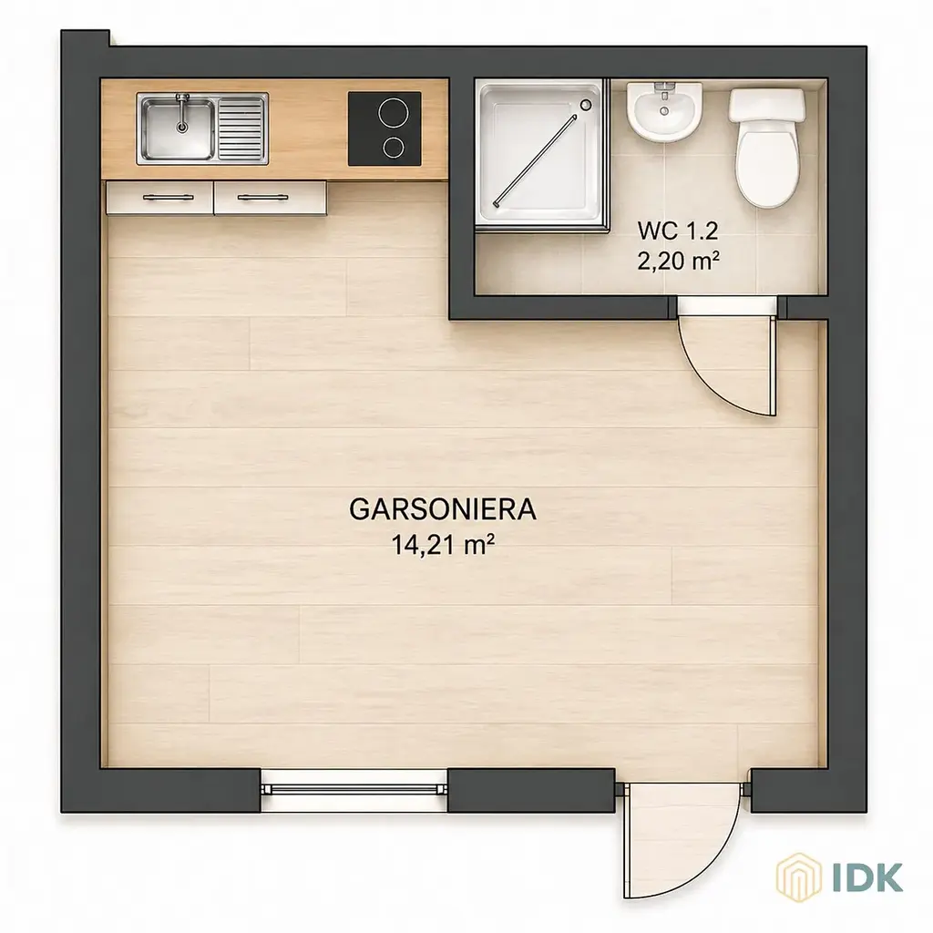 Garsoniéra má obytnou místnost s kuchyňským koutem a samostatnou koupelnu se sprchovým koutem, umyvadlem a WC. Kuchyňský kout je vybaven základní linkou, dřezem a malou lednicí.
