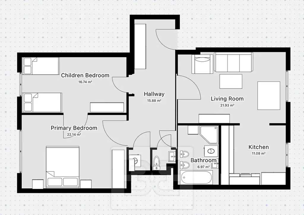 Byt se skládá z předsíně, kde v pravé straně jsou dvě ložnice (orientované do klidné ulice), v centrální části bytu je pak komora, samostatný záchod a vstup do prostorné koupelny, která je prosvětlena denním světlem luxferami. V levé části bytu je pak obývací pokoj s prostornou kuchyní, obě místnosti jsou orientovány do vnitrobloku. Vytápění zajišťuje plynový kotel.