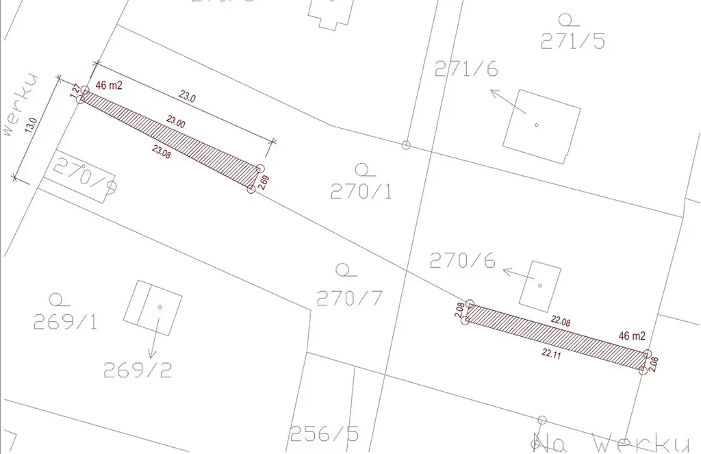 Na pozemku je možné umístit stavbu rodinného domu o zastavěné ploše až 105 m2 a až dvou podlažích s obytným podkrovím + vedlejší stavba 34 m2, podle přiložené architektonické studie. Současná hranice pozemku je upravena geometrickým plánem podle přiloženého plánu.