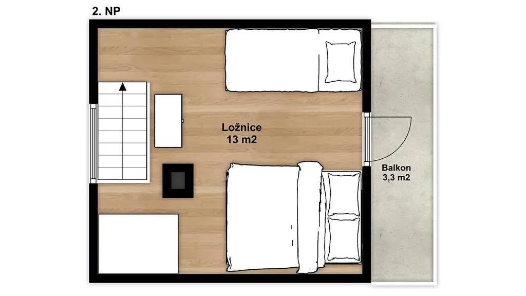 Tato dřevěná chata s obytným podkrovím nabízí veškeré pohodlí pro vaši dovolenou. V přízemí se nachází terasa, kde si můžete vychutnat své ranní kávové chvilky nebo večerní posezení s rodinou a přáteli. Uvnitř chaty najdete útulný obytný pokoj, vybavenou kuchyni, sklad a WC. V podkroví se nachází prostorná ložnice se třemi lůžky a balkonem, odkud si můžete vychutnat krásný výhled na okolní přírodu.