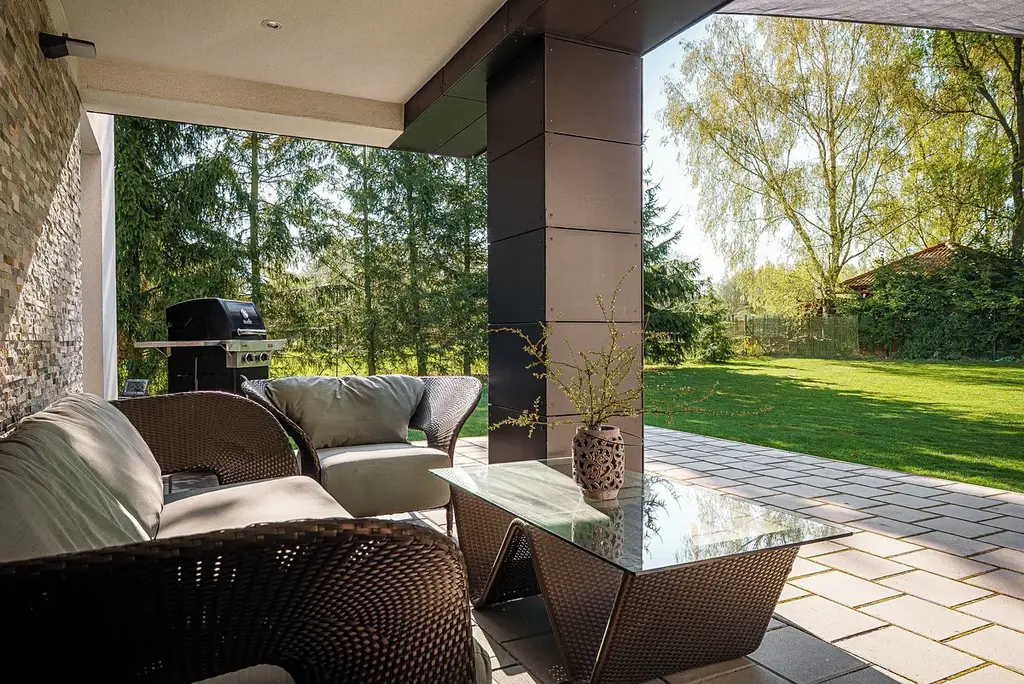 • Kvalita bez kompromisů: Dům je postaven z tvárnic Ytong se zateplením (20 cm) a fasádou z obkladových desek Cembrit a kamene. Hliníková okna s trojskly a elektrickými venkovními žaluziemi zaručují dokonalý tepelný komfort.