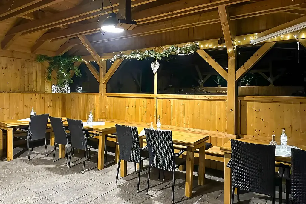 Společenská budova nabízí kuchyňské zázemí a výčepem, společně s nově vybudovanou zastřešenou pergolou s ohništěm a grilem, nabízí posezení až pro 50 osob.
