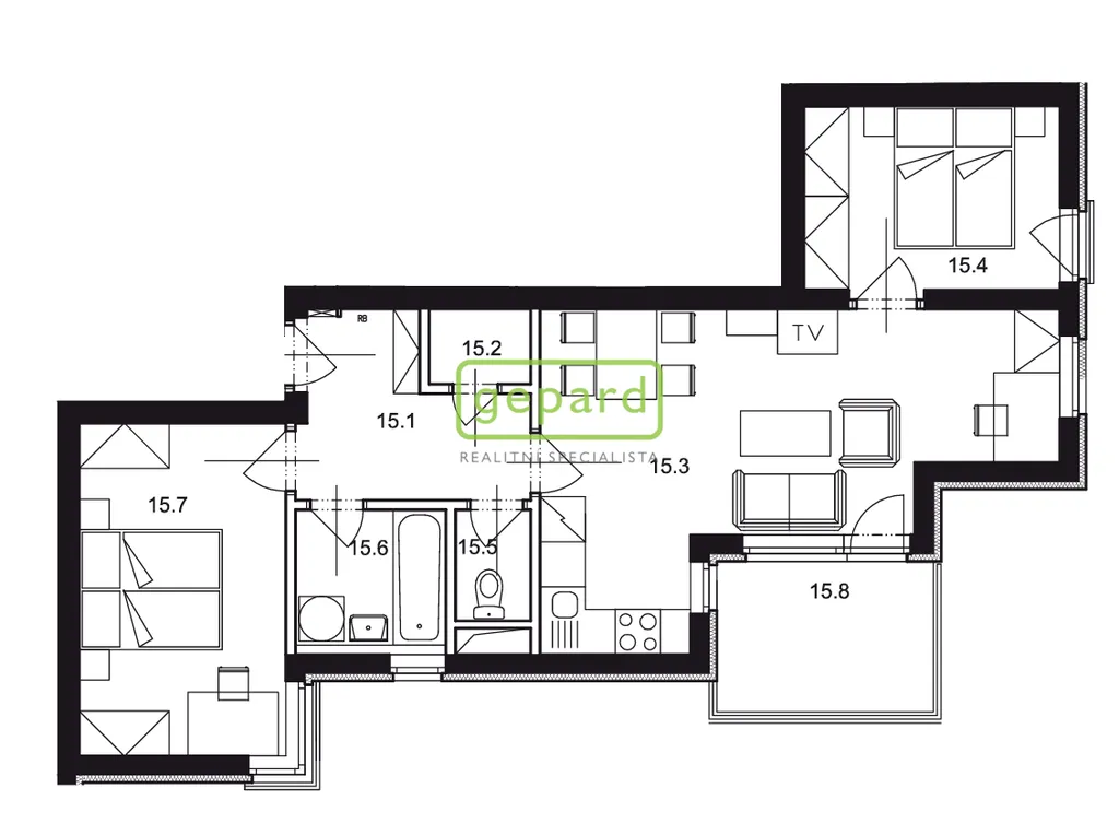 Byt se nachází v 3. NP domu a je orientován na jižní stranu. Dispozičně je byt řešen tak, že z hlavního vstupu vcházíte do předsíně, ze které je samostatný vstup do jedné z ložnic, obývacího pokoje s kuch. koutem a také do komory, koupelny a na WC. Druhá ložnice je přístupná přímo z obývacího pokoje. Z obývacího pokoje s kuchyňským koutem je vstup na balkon. Koupelna je s vanou, WC je samostatné. Byt má zděné příčky, vinylovou podlahu s dubovým dekorem, dřevěná eurookna s dvojskly. Výhodou je optická síť až do domu pro internet, telefon a kabelovou televizi.