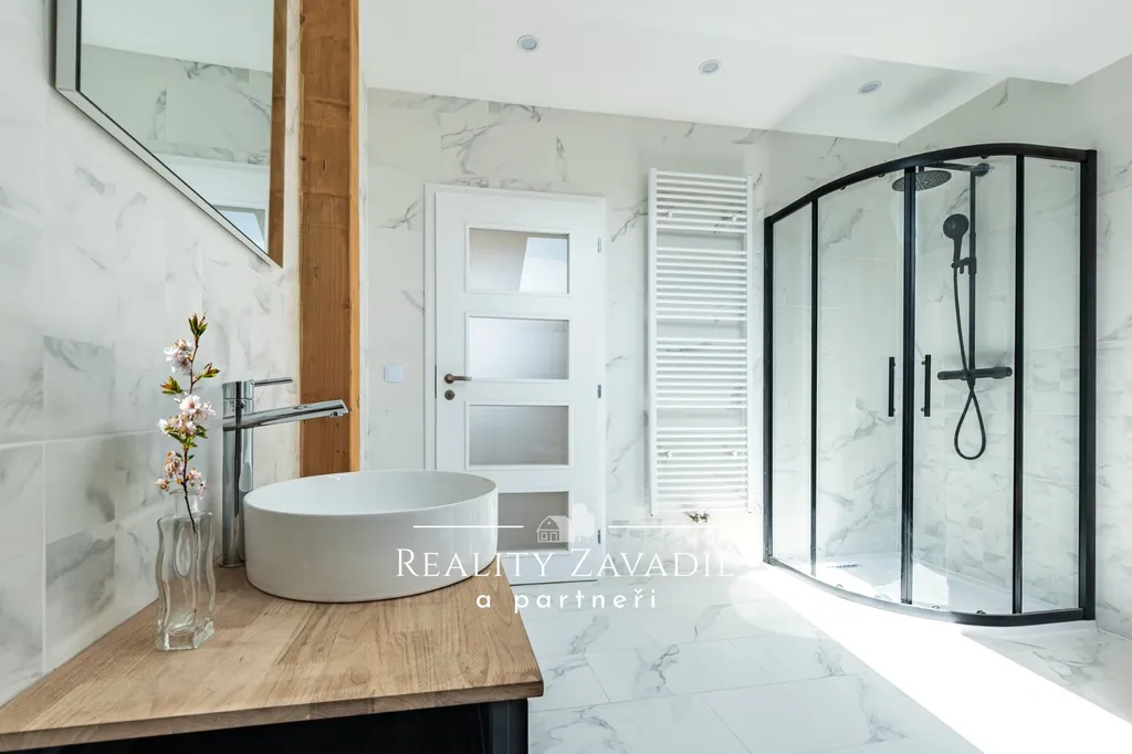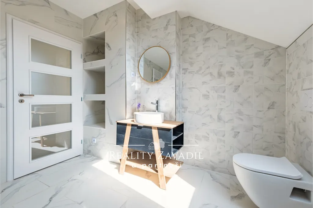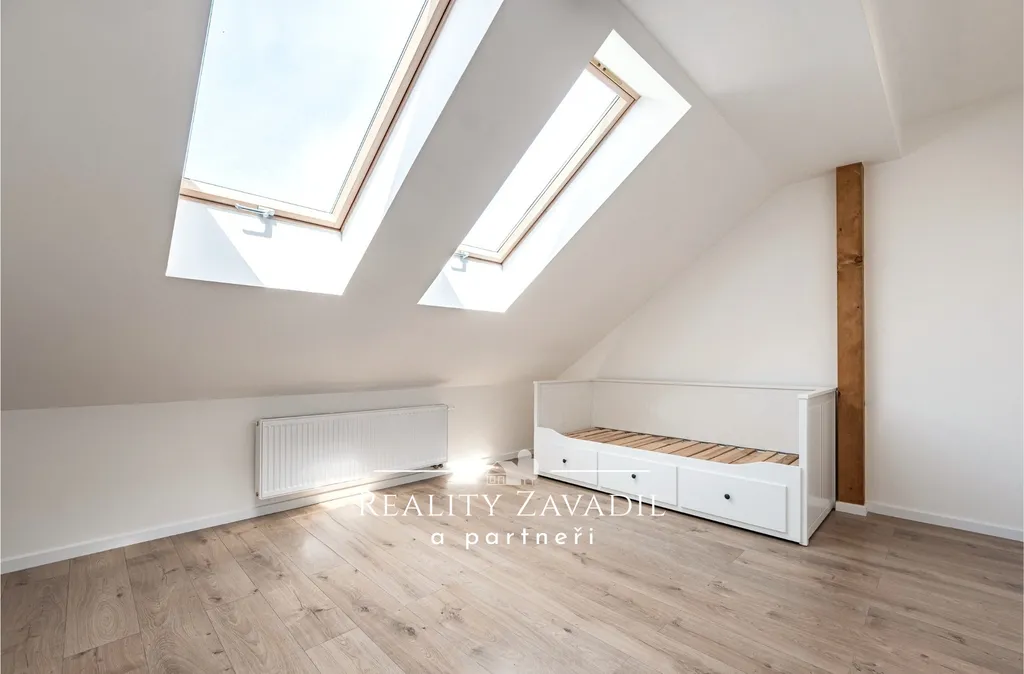 V patře se nachází 3 prostorné neprůchozí pokoje, 2 koupelny a technická místnost.