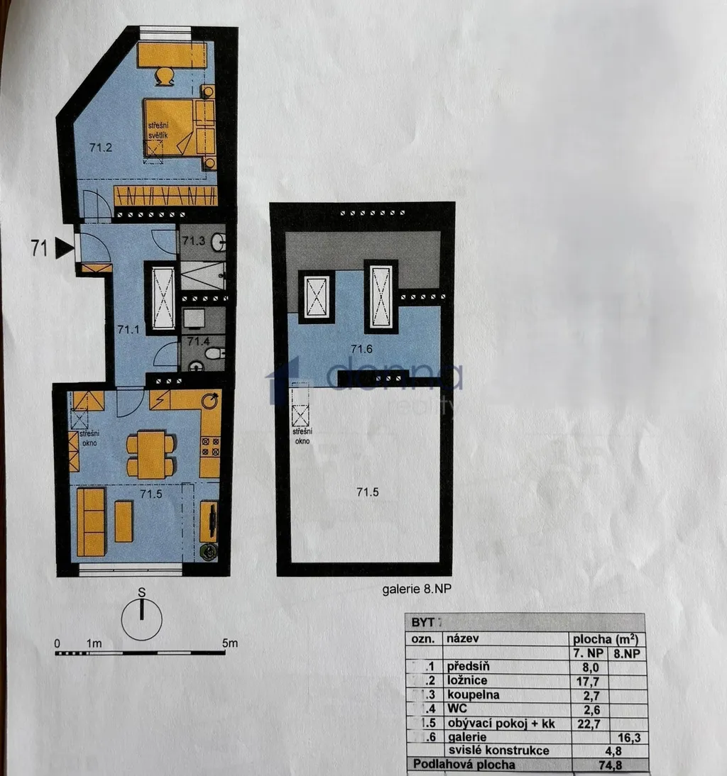 Obývací pokoj s kuchyňským koutem (22,7 m²), samostatnou ložnici (17,7 m²), koupelnu (2,7 m²), oddělené WC (2,6 m²), galerii (16,3 m²) a předsíň (8,0 m²).