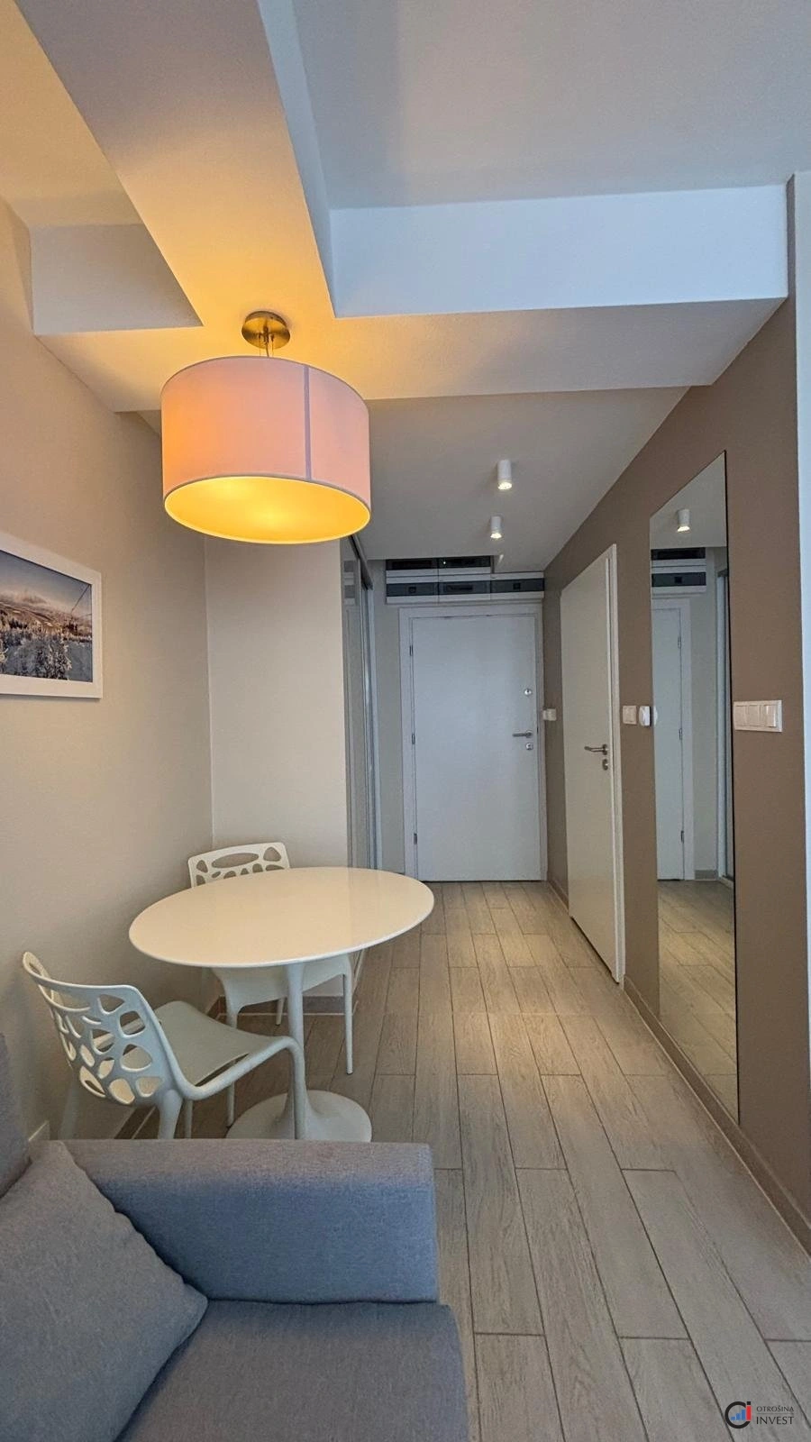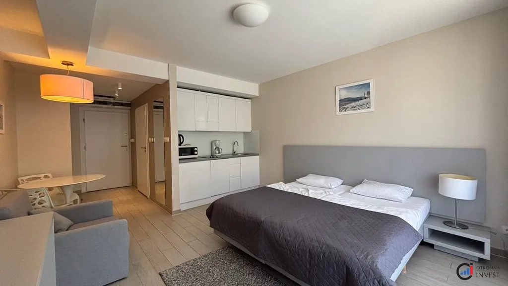 Apartmán sestává z obývacího pokoje s kuchyňským koutem, předsíně, koupelny a balkonu. Nábytek a vybavení jsou součástí ceny.