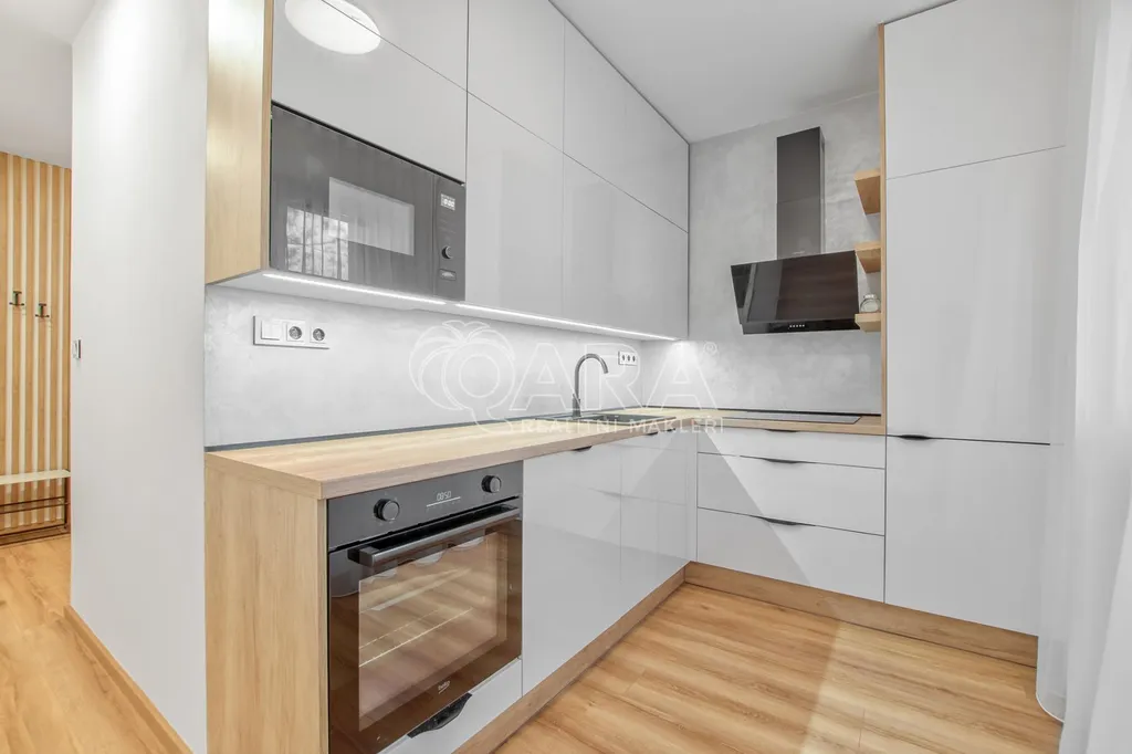 Kuchyňská linka byla vyrobena na míru až ke stropu, aby maximálně využila prostor pro ukládání věcí. Její součástí jsou kvalitní vestavné spotřebiče včetně lednice s mrazákem, myčky, trouby a mikrovlnné trouby. Vaření zajišťuje moderní indukční deska s digestoří. Další úložné prostory nabízí vestavná skříň na chodbě a sklep, který k bytu náleží.
